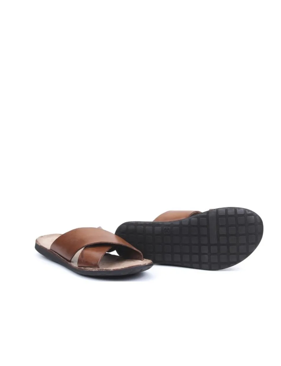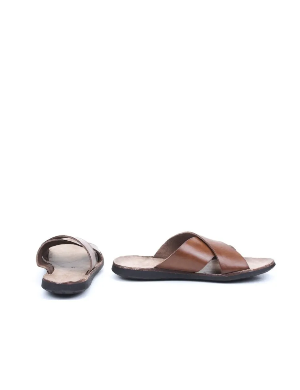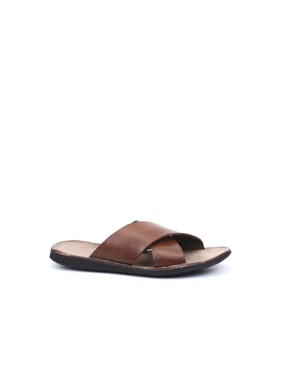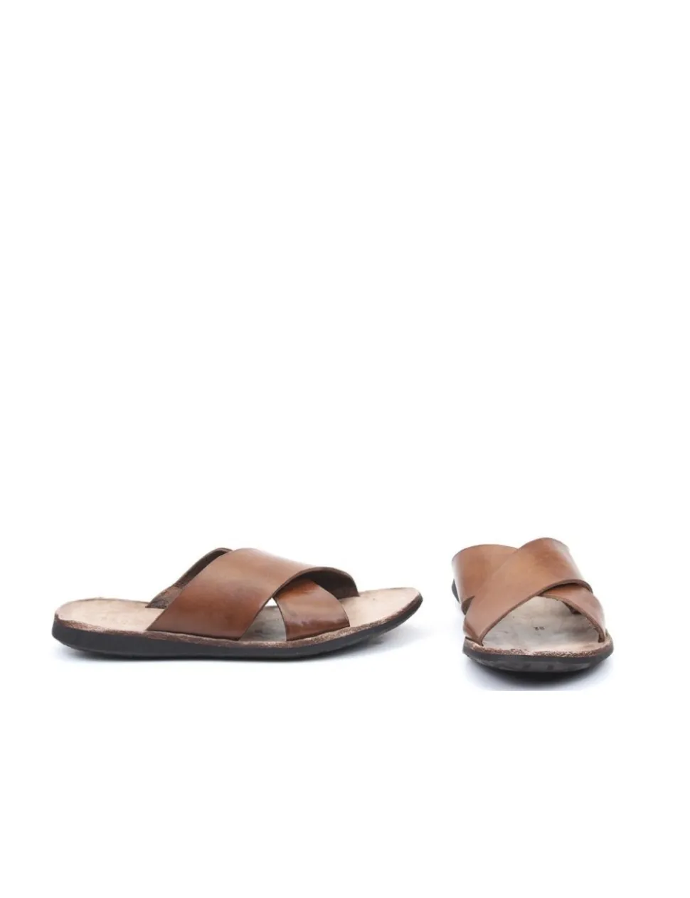Sandalo basso in vitello, colore cuoio, effetto vintage