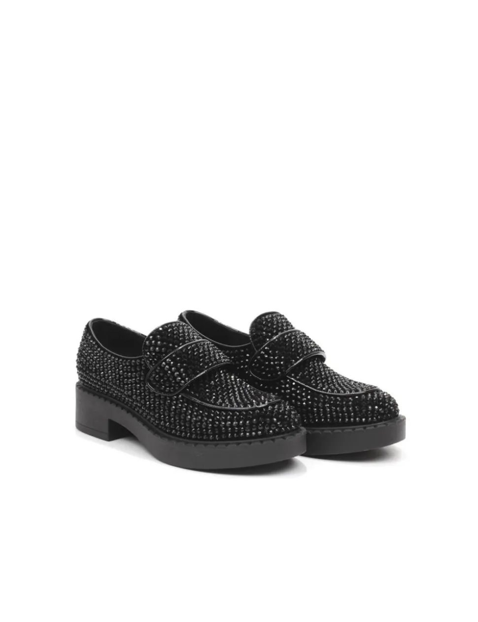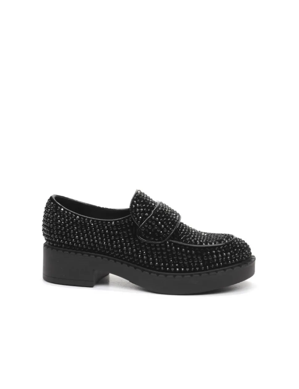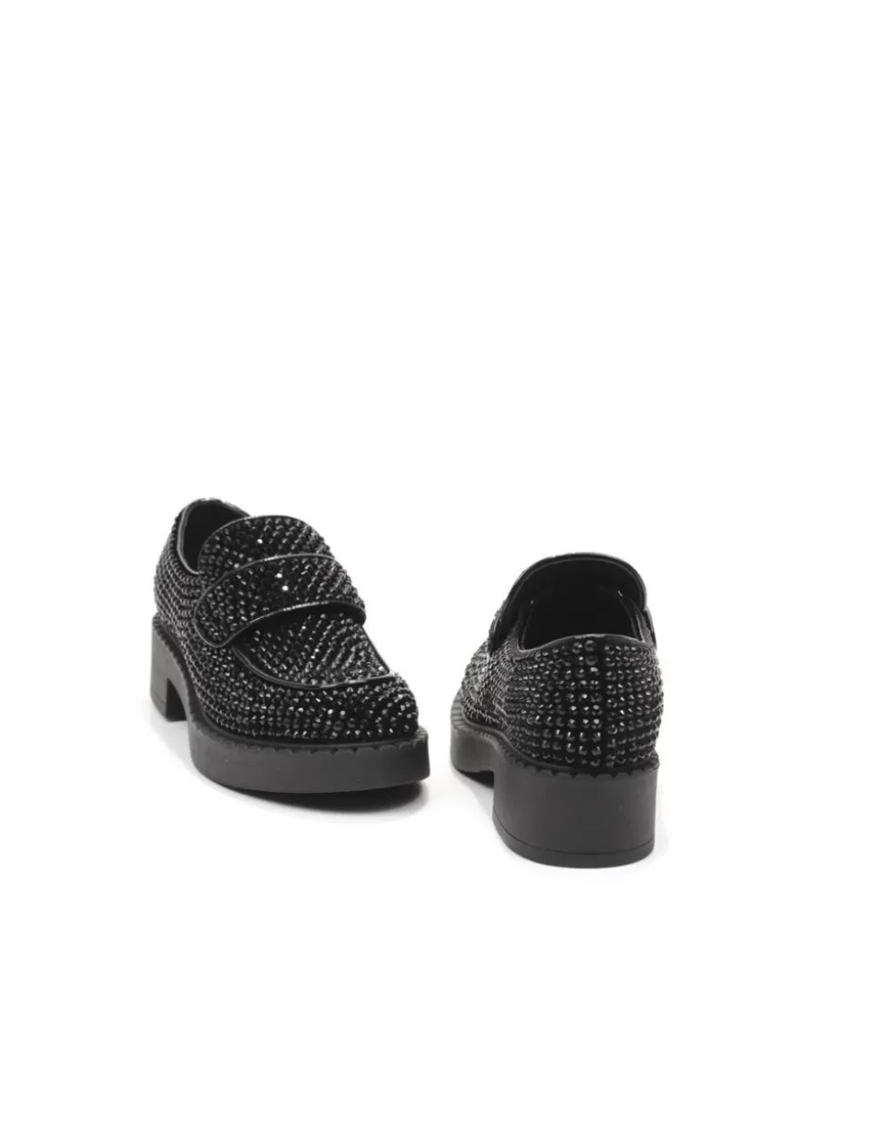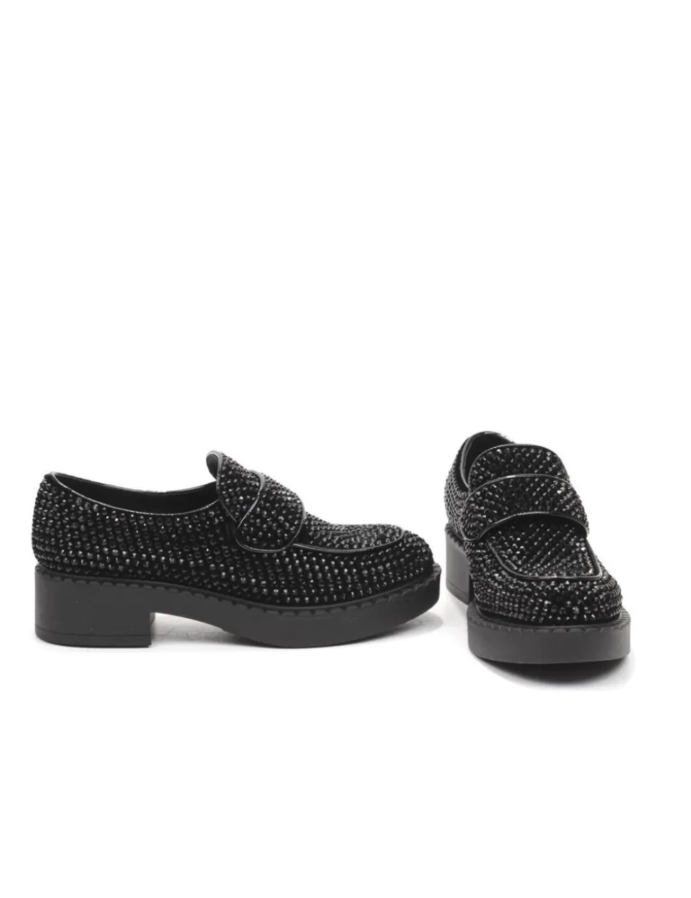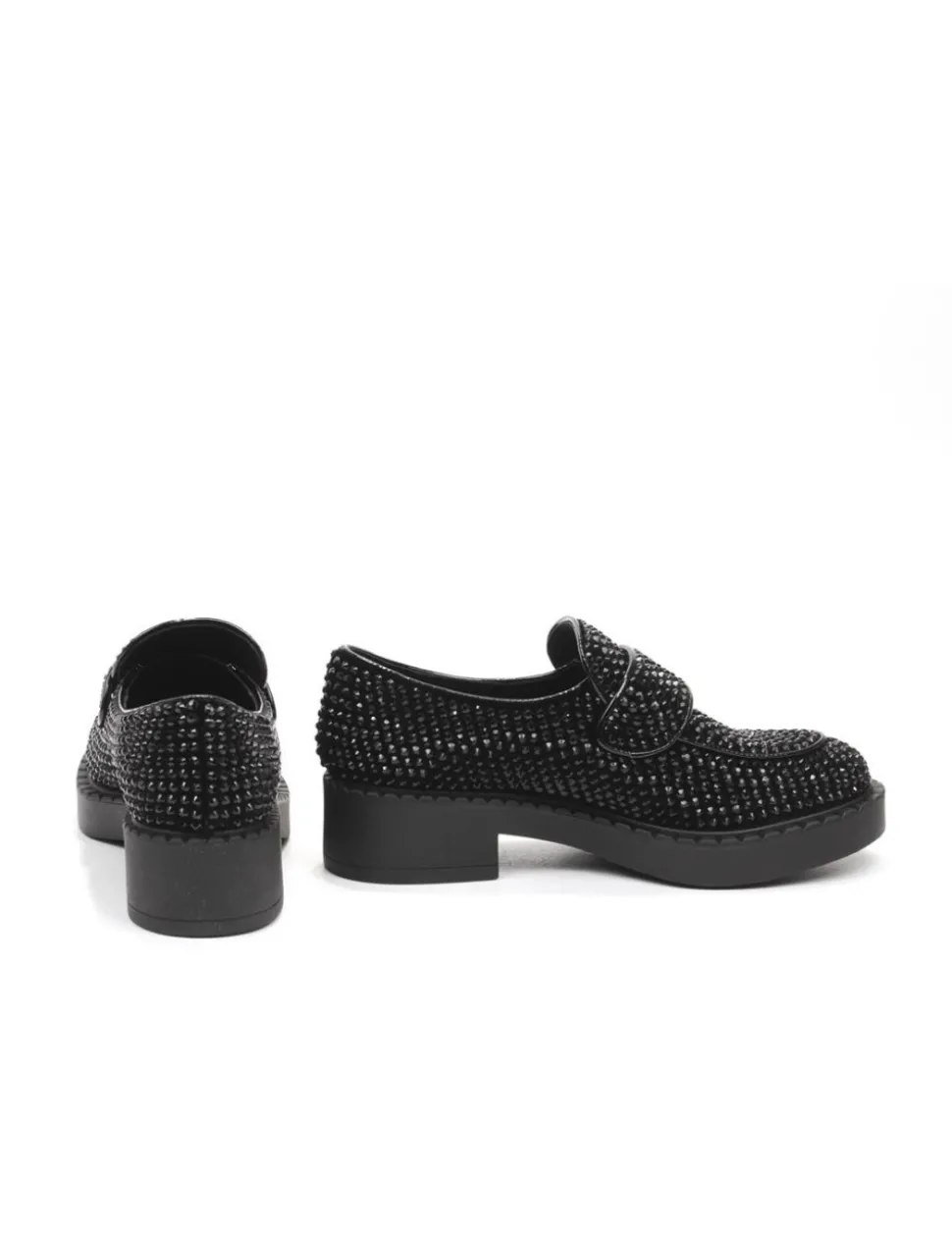 Mocassino con tacco in pelle nera ricoperto di brillantini