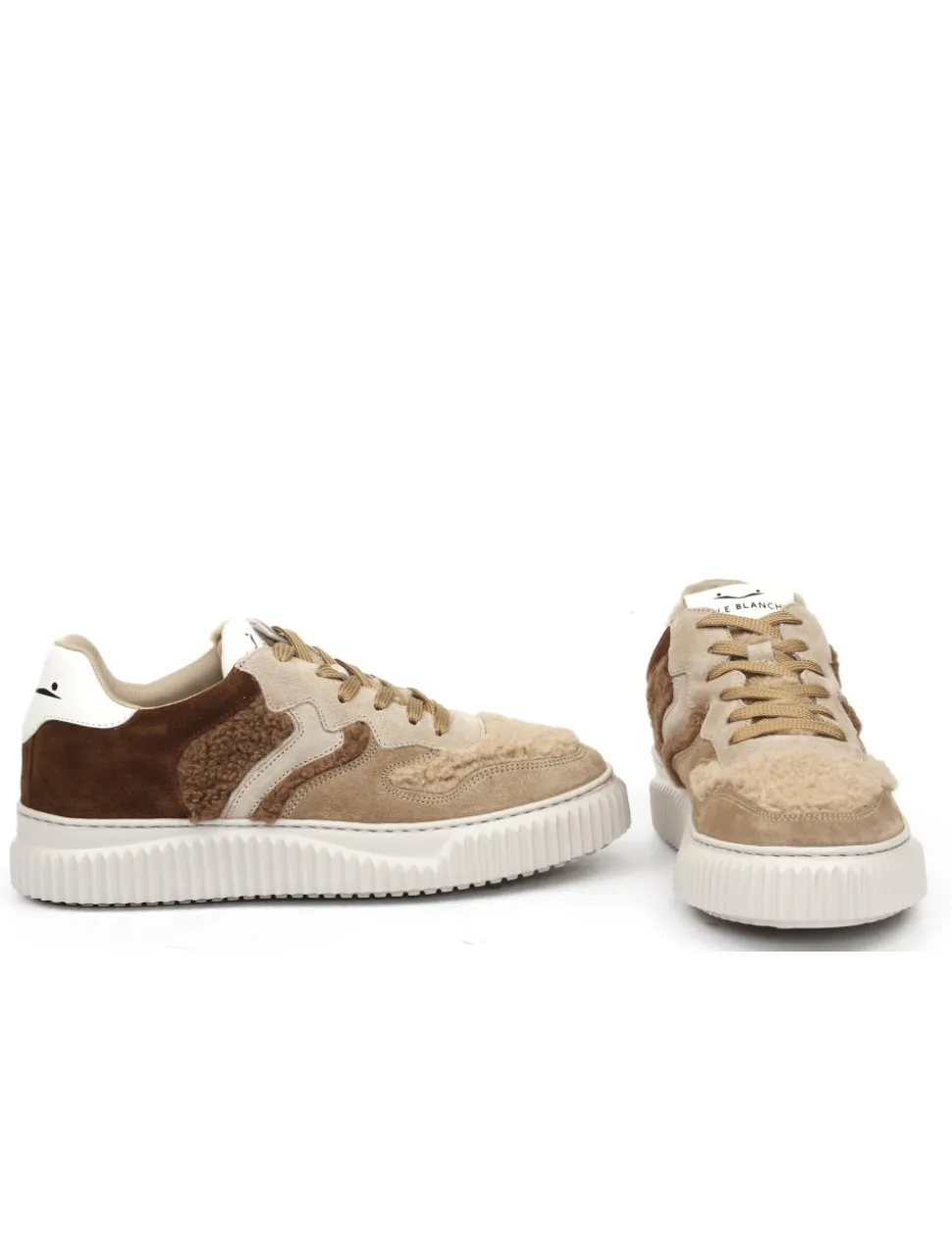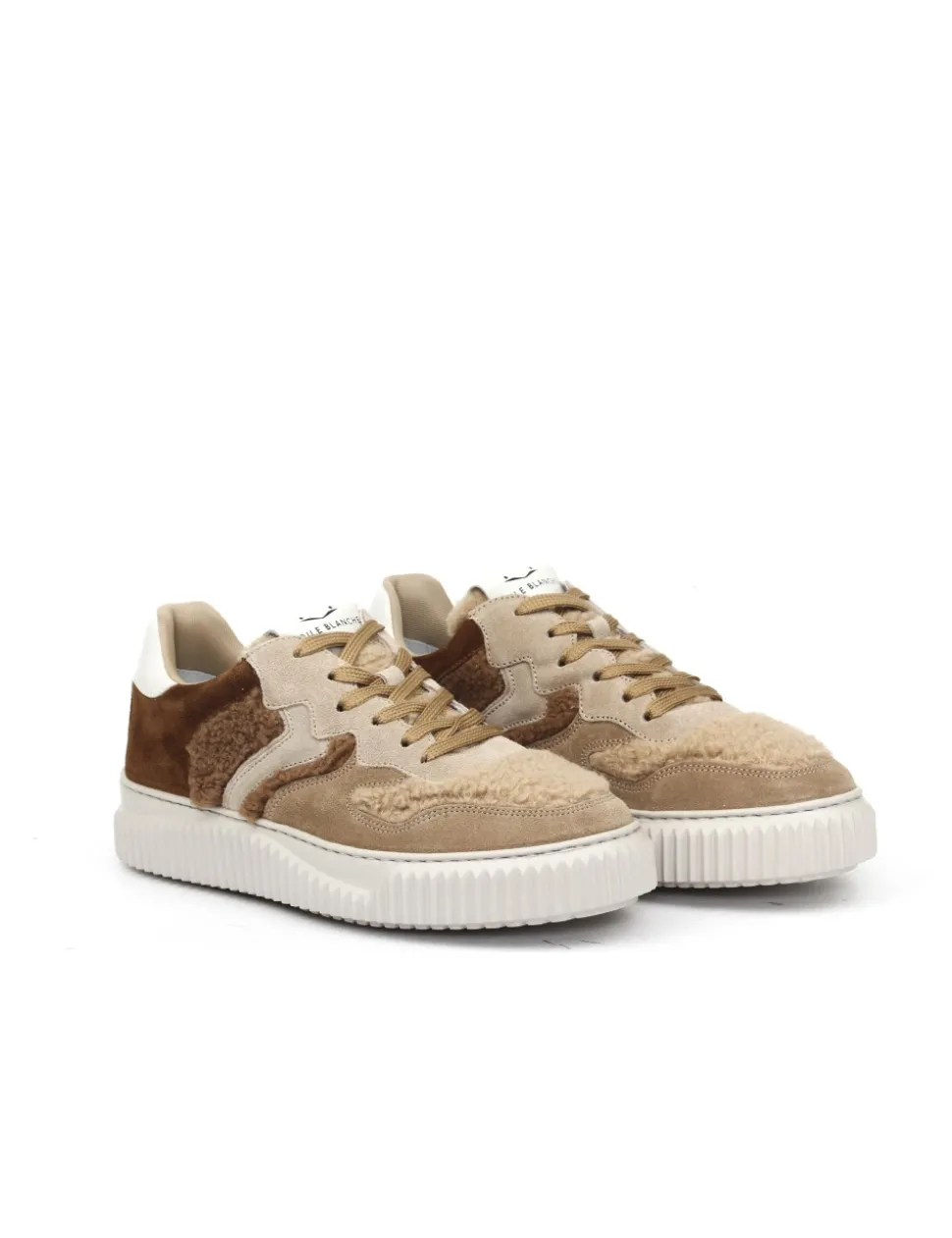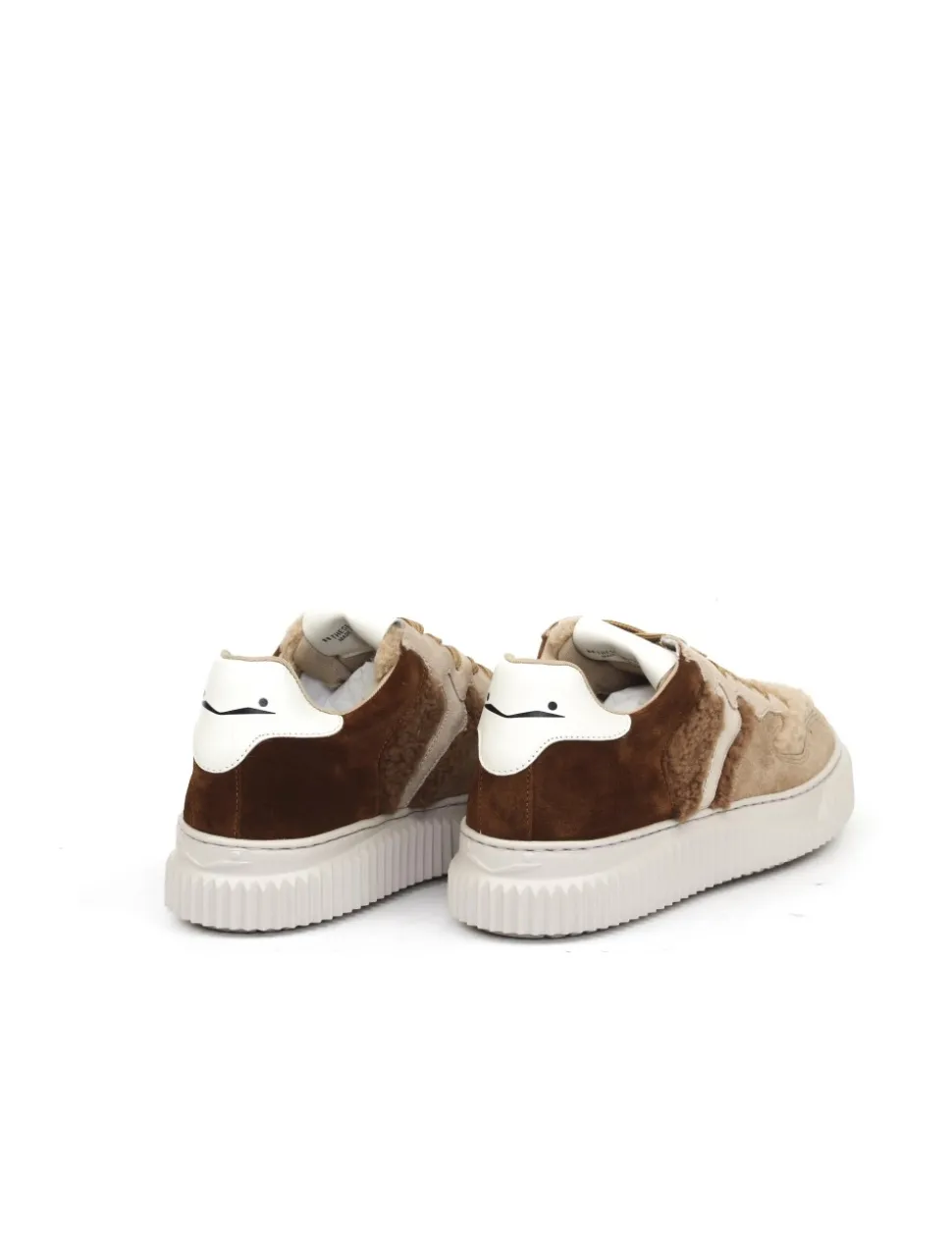 Sneaker in camoscio beige e marrone, con pelo esterno